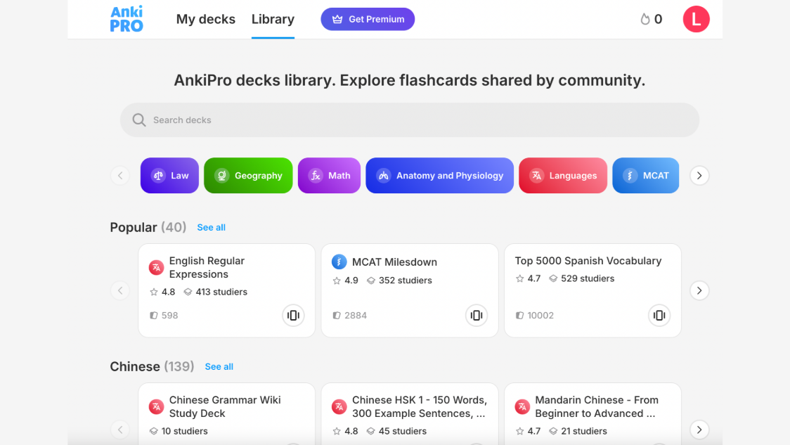 Kho thẻ có sẵn đa dạng, nhiều chủ đề Không được thiết kế riêng cho việc học ngôn ngữ
