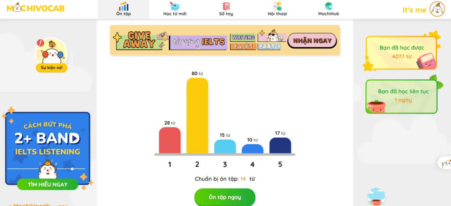 MochiMochi là cái tên không còn xa lạ với người học ngoại ngữ tại Việt Nam. Ứng dụng này được thiết kế giúp người dùng cải thiện vốn từ vựng và khả năng ghi nhớ hiệu quả, đặc biệt cho các bạn đang luyện thi IELTS.