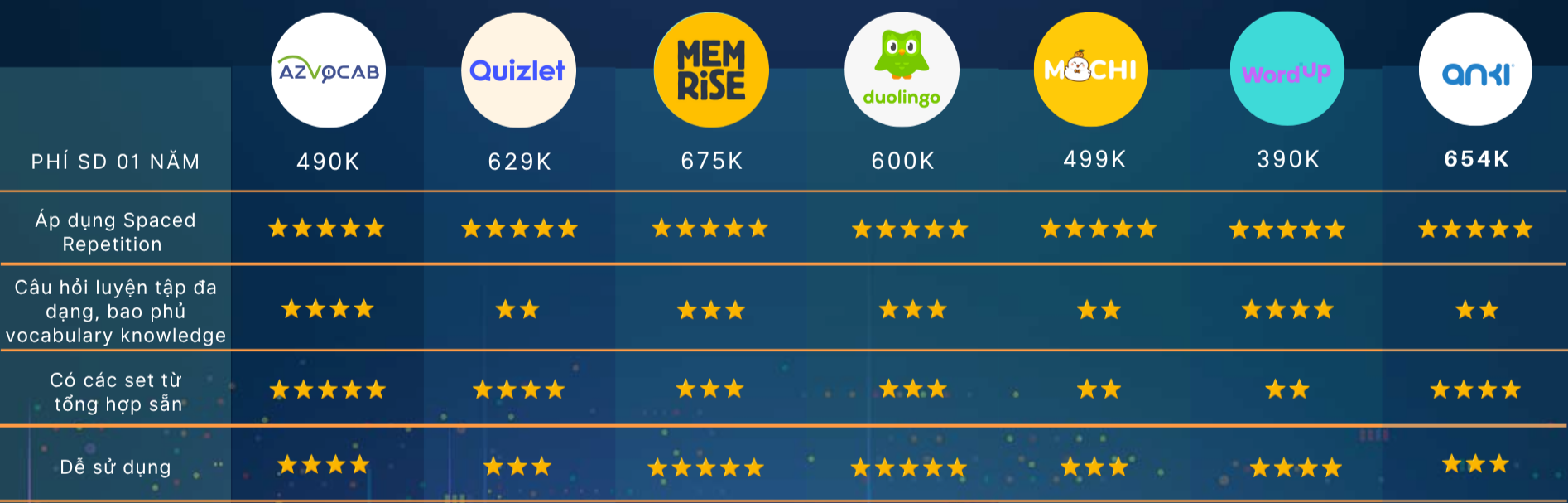 Dựa theo các nghiên cứu và trải nghiệm sử dụng ứng dụng trực tiếp, azVocab đã so sánh 7 app học từ vựng áp dụng kỹ thuật lặp lại ngắt quãng dưới đây theo 05 tiêu chí: