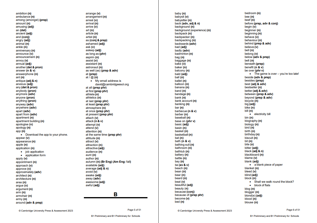 Để giúp các em chuẩn bị tốt cho bài thi, Cambridge English cung cấp danh sách từ vựng cần biết cho B1 PET. Danh sách từ vựng B1 PET này gồm có: