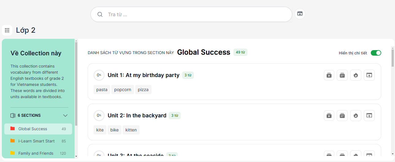 Đầu tiên hãy vào collection từ vựng tiếng Anh lớp 2 được tổng hợp sẵn theo các bộ sách trên azVocab. Mỗi bộ sách là một section, trong này sẽ gồm có các set từ là các Unit trong sách. Học viên có thể truy cập để xem từng từ trong set, thêm toàn bộ set từ vào sổ hoặc chỉ thêm những từ mình chưa biết.
