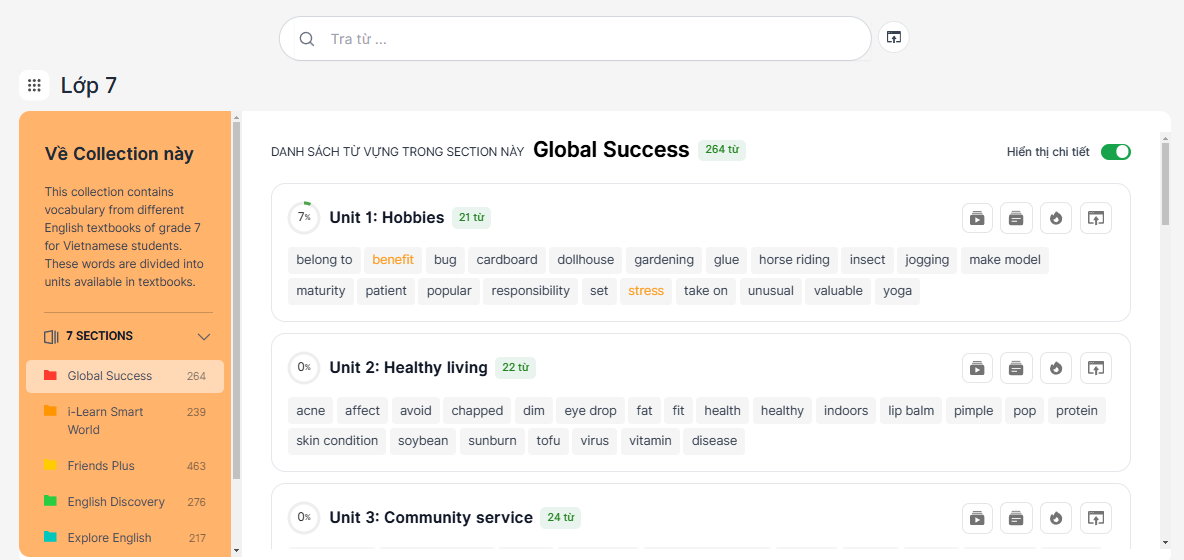 Đầu tiên hãy vào collection từ vựng tiếng Anh lớp 7 được tổng hợp sẵn theo các bộ sách trên azVocab. Mỗi bộ sách là một section, trong này sẽ gồm có các set từ là các Unit trong sách. Học viên có thể truy cập để xem từng từ trong set, thêm toàn bộ set từ vào sổ hoặc chỉ thêm những từ mình chưa biết.