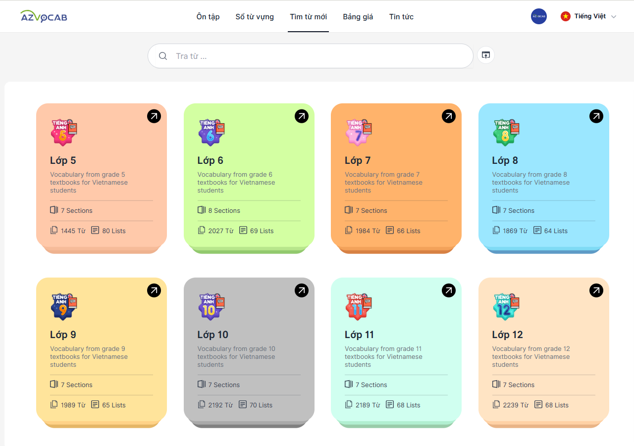 azVocab tổng hợp đầy đủ bộ từ vựng từ lớp 1 đến lớp 12